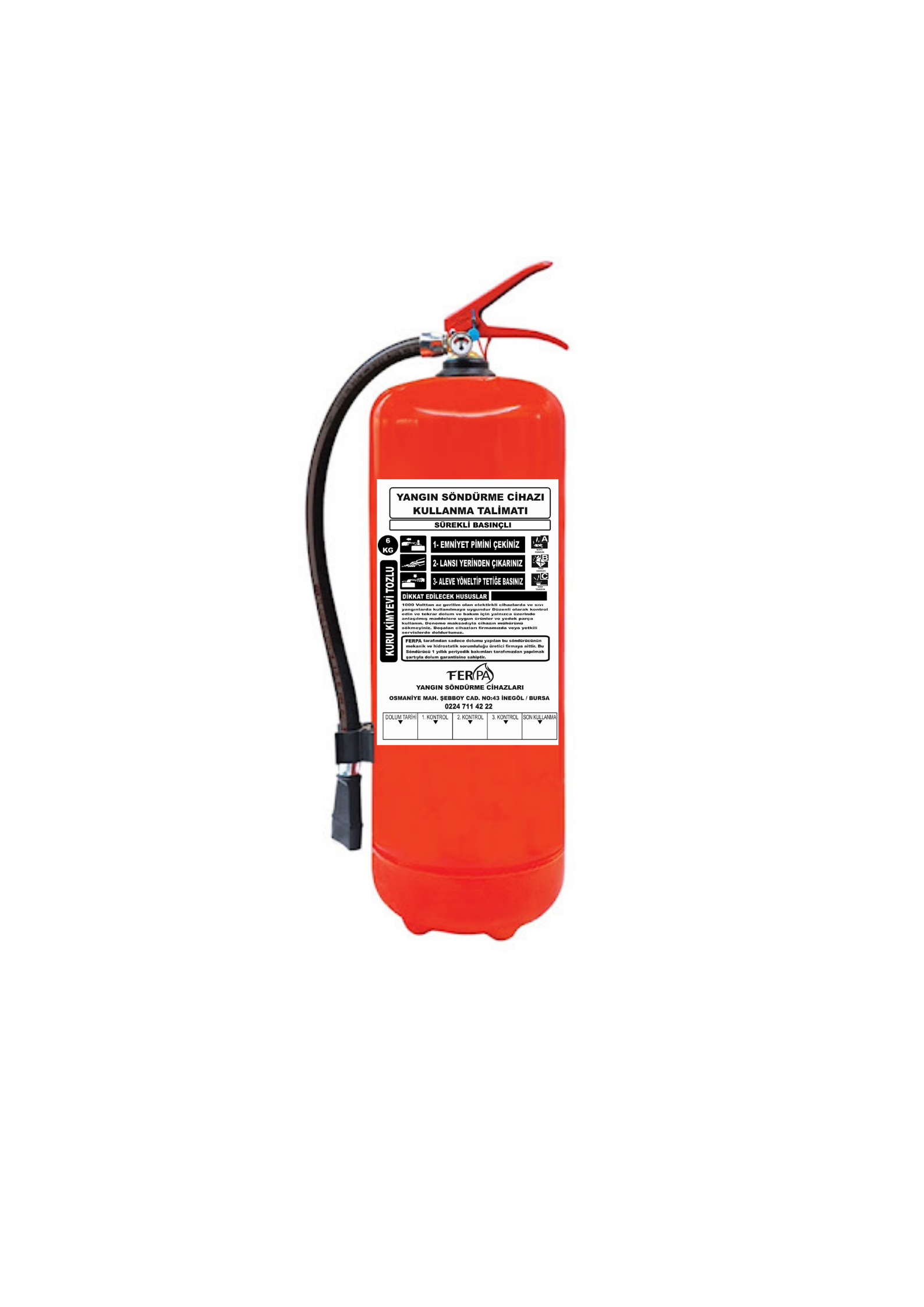 6 KG Kuru Kimyevi Tozlu Yangın Tüpü, A, B ve C sınıfı yangınlara karşı etkili, güvenilir bir yangın söndürme cihazıdır. İçerisinde kuru kimyevi toz (ABC tozu) bulunur ve yüksek söndürme kapasitesi sayesinde ev, iş yeri, depo, fabrika, okul, otopark ve benzeri alanlarda tercih edilmektedir.